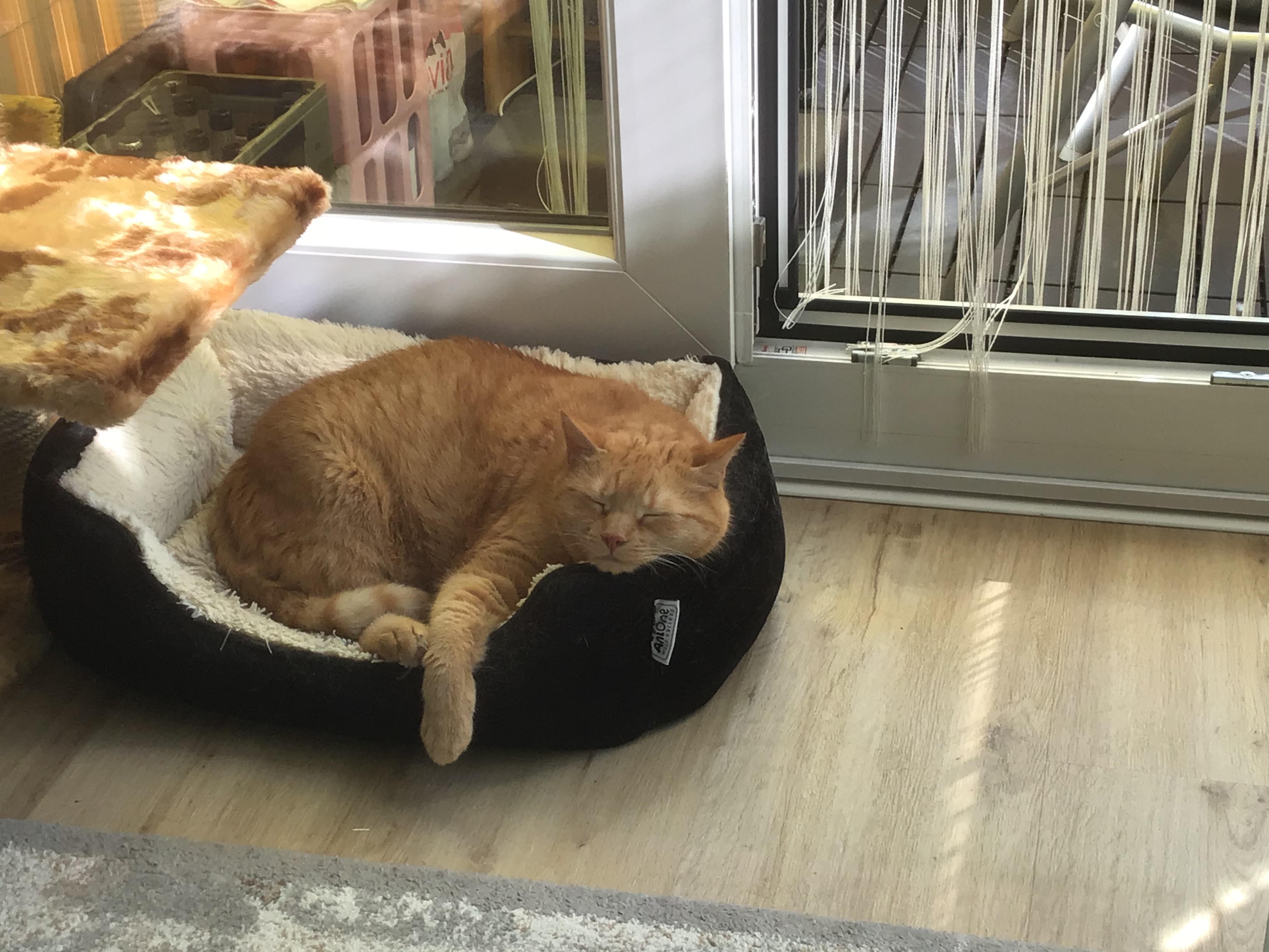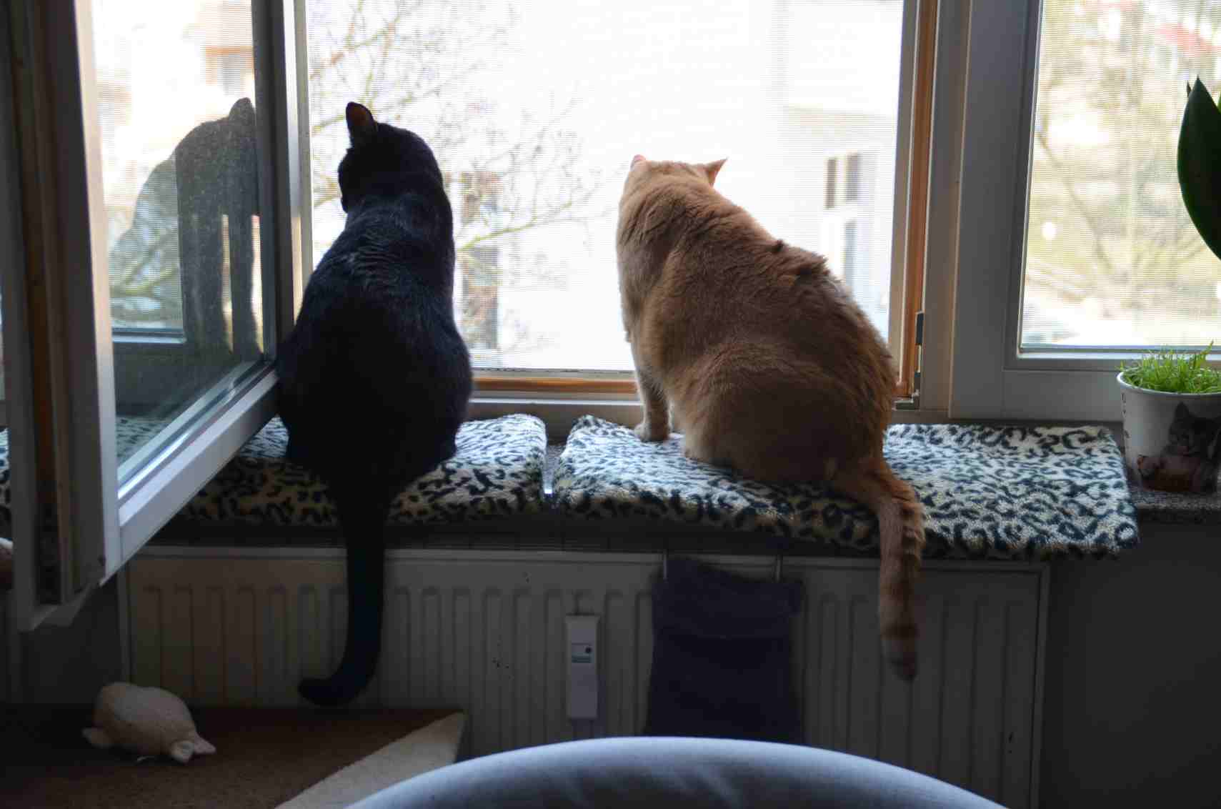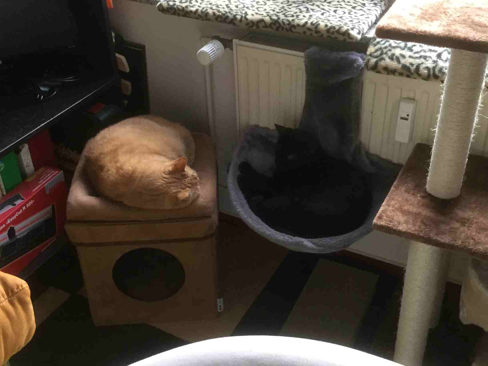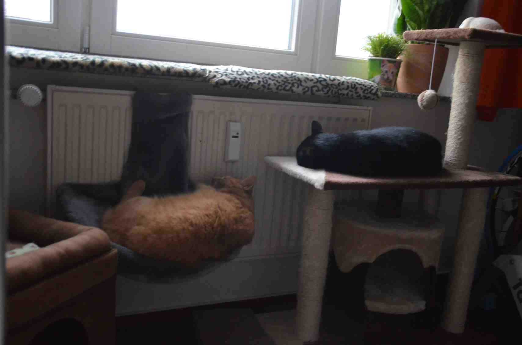 Auch die Schlafplätze teilte man, wenn Micky und Spiky als Geschwister noch eng beieinander lagen, dann lagen Spiky und Nelson zumindest im Schlaf immer in der Nähe. Gemeinsam schaute man aus dem Fenster oder chillte. Die Entspannung lag auch in der Nähe zueinander, eine entspannte Katze liegt zusammengerollt. Ich nenne das die „Rollmopsstellung“ oder in U-Form, die „Shrimpsstellung“.