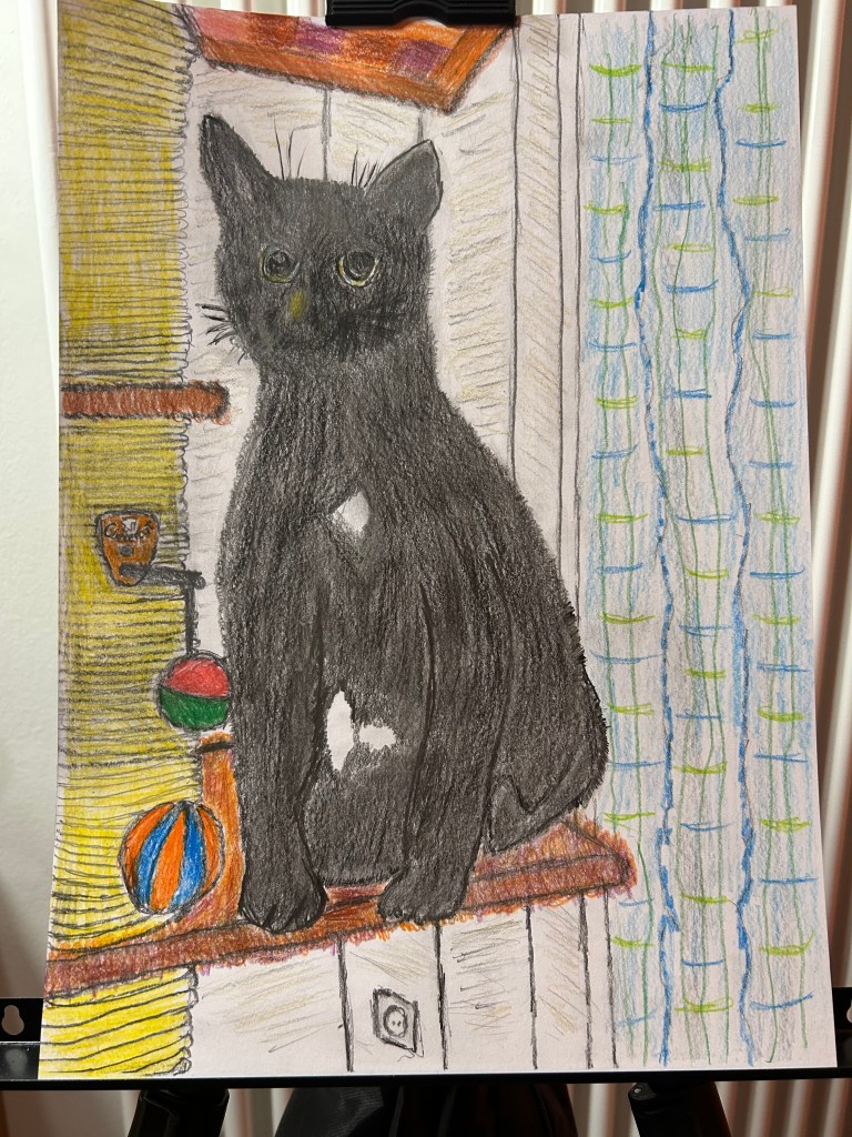 Als ich etwas Muße hatte, habe ich eins meiner Lieblingsbilder von unserem Kater Nelson mit einiger Naivität und mit dem Blick, wie ich ihn gesehen habe, zu Papier gebracht und diesen Herbst habe ich ihn auf A3 skizziert und koloriert. Das wird eines der neuen Inhalte im kommenden Jahr sein. Es wird immer ein Bild und eine Geschichte dazu geben. Aber zunächst das heutige Bild.