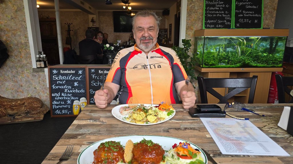 Der zweite Tag war ziemlich brutal, wir mussten permanent bei Regen entlang der Oder radeln. Aber in einem eher unscheinbaren kleinen Gasthof der Gaststätte und Pension Fuchsbau kurz vor Hohenwutzen an der Strecke wurden wir mit einem sowohl optisch, als auch kulinarisch ausgezeichneten Essen belohnt.