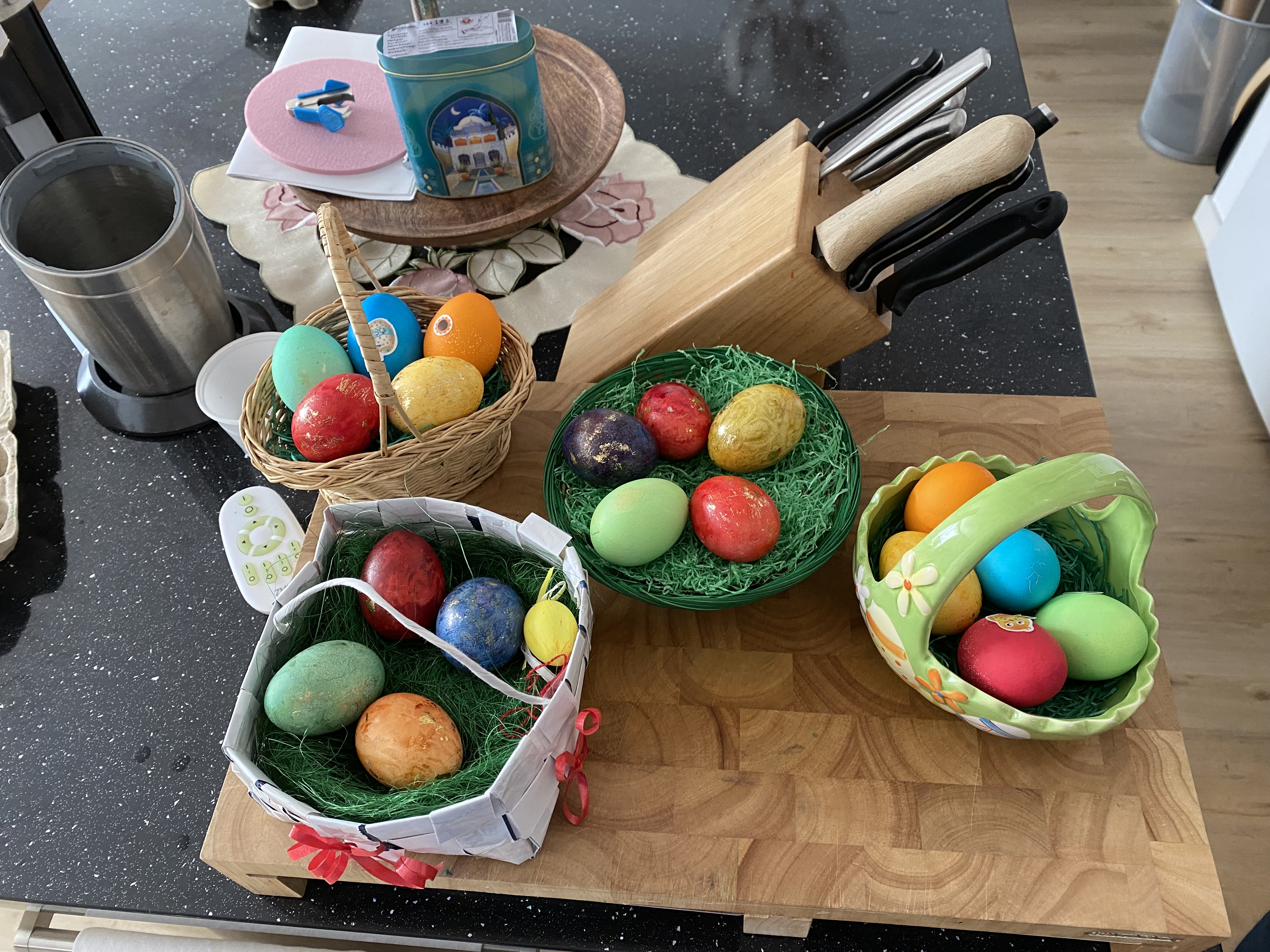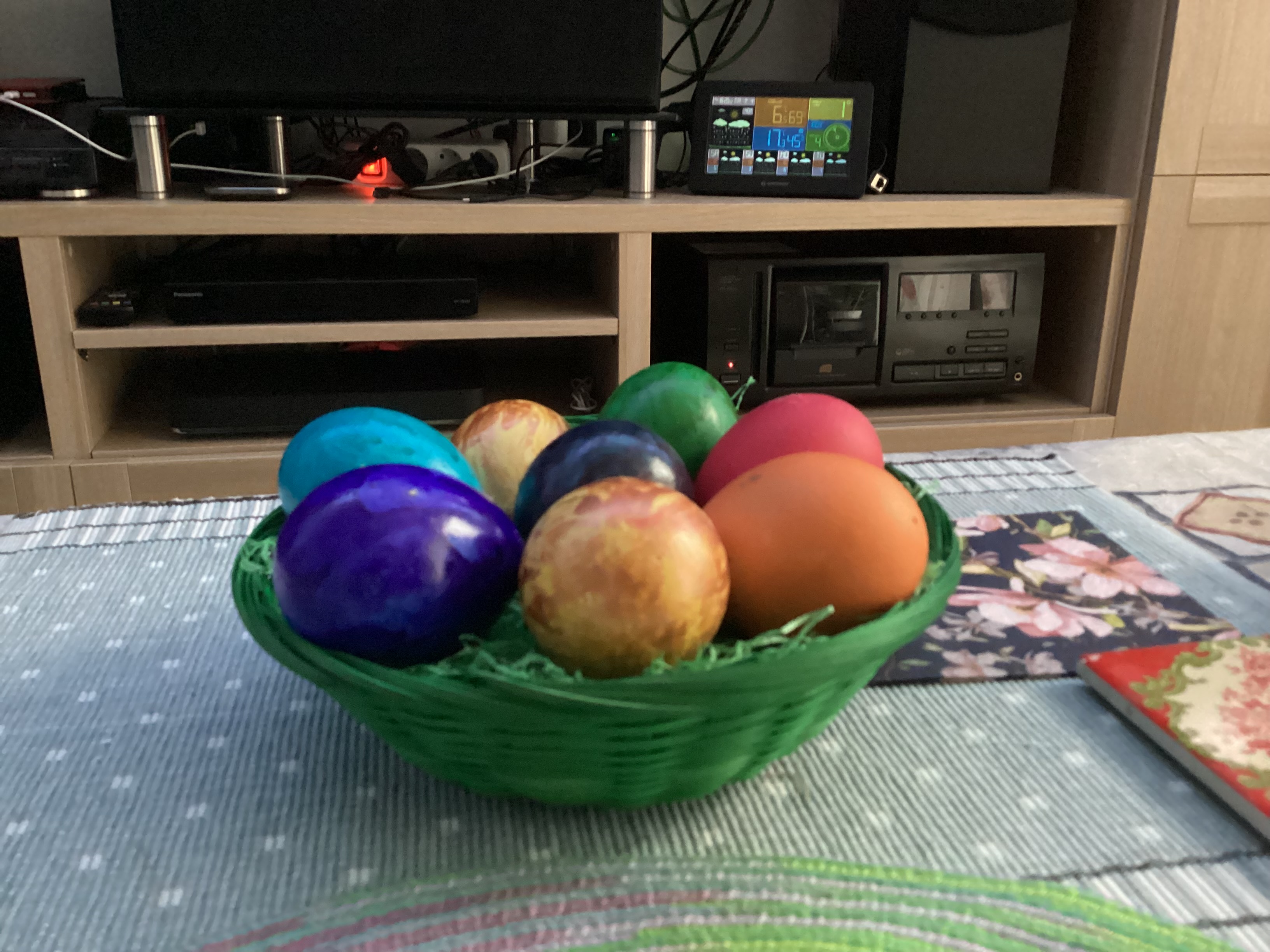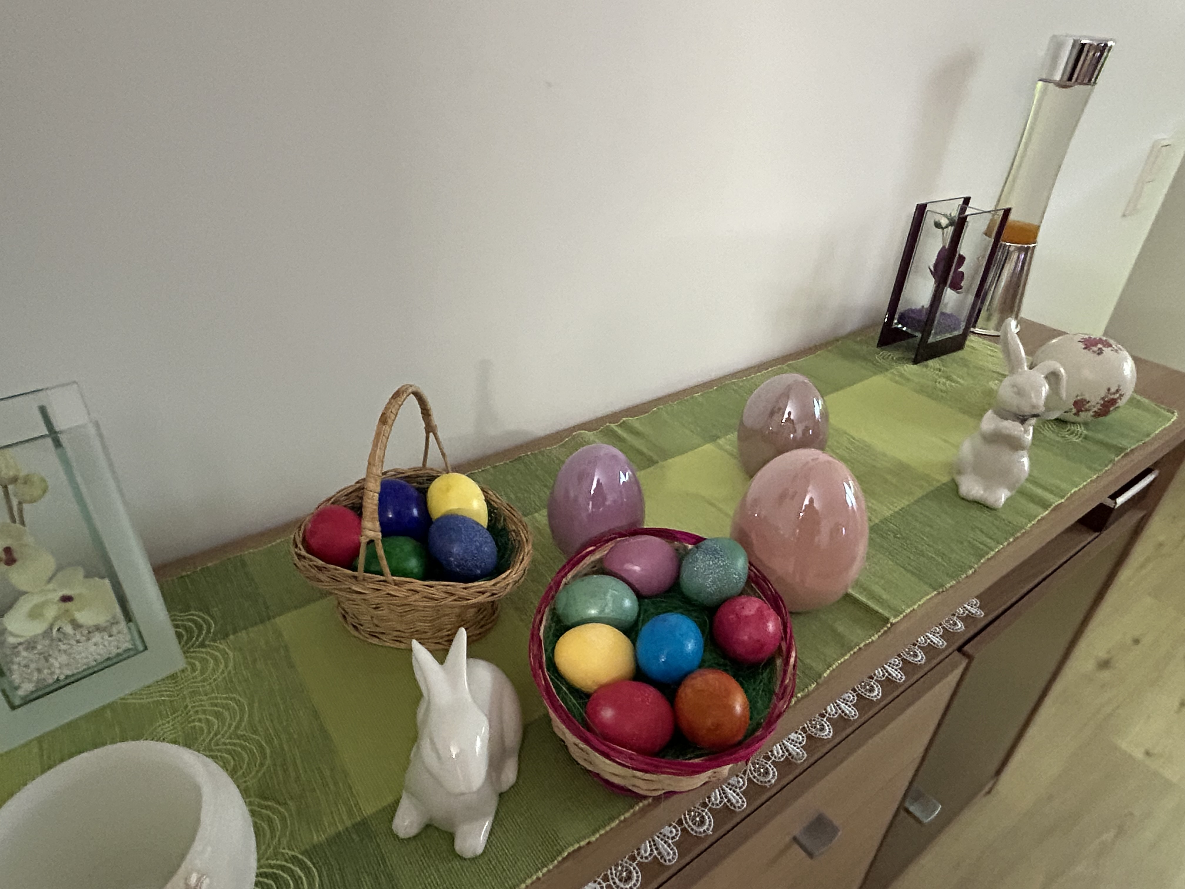 Heute, da die Kinder erwachsen sind und ihren eigenen Haushalt leben, ist noch das traditionelle Eierfärben geblieben. Die bunten Eier symbolisieren die Rückkehr der Farben in die Welt und das Ei das Leben, auch wenn es nach dem Kochen erlischt und das Ei am Ende durch Verzehr in den Lebenskreislauf zurückgegeben wird.
