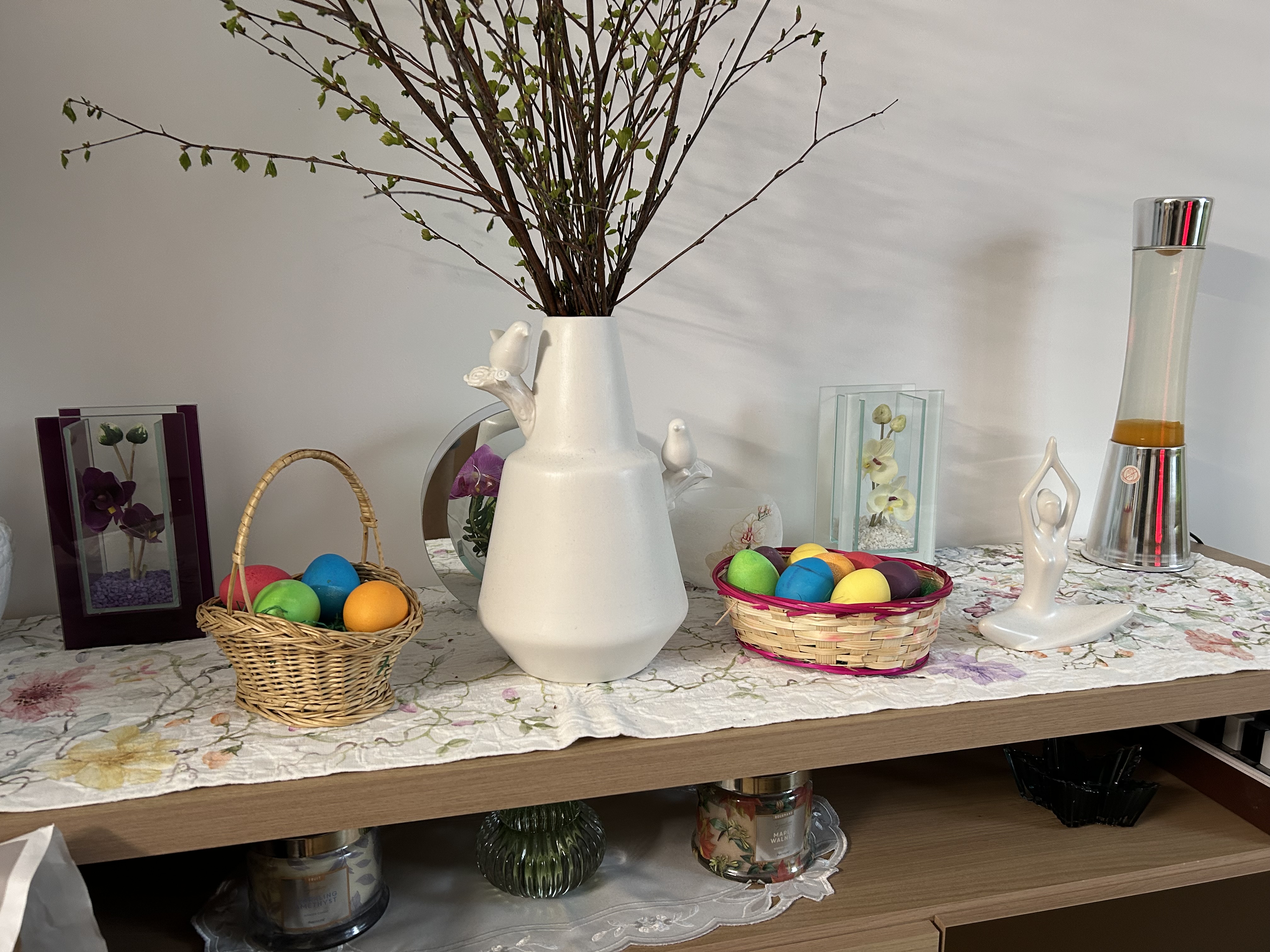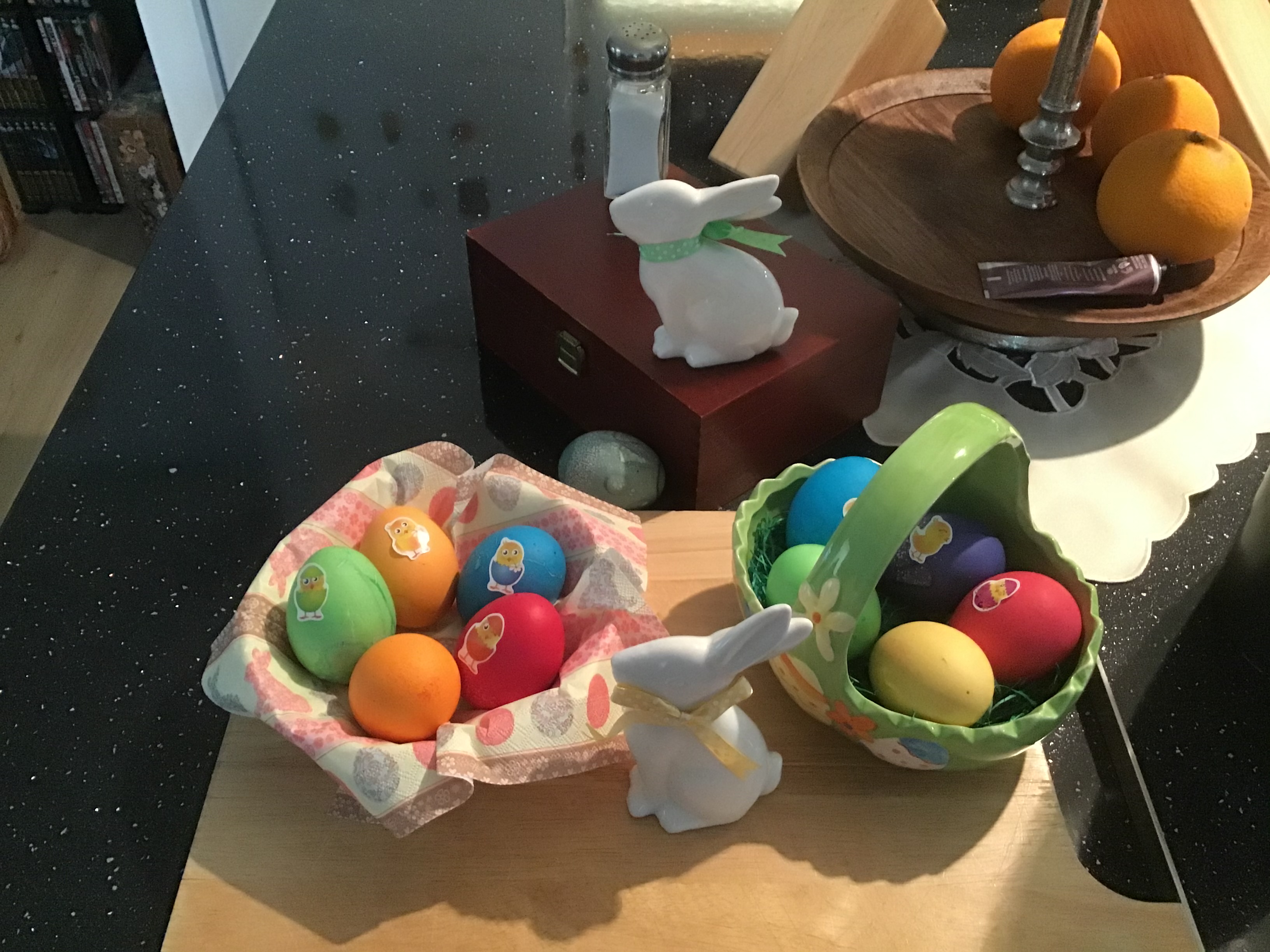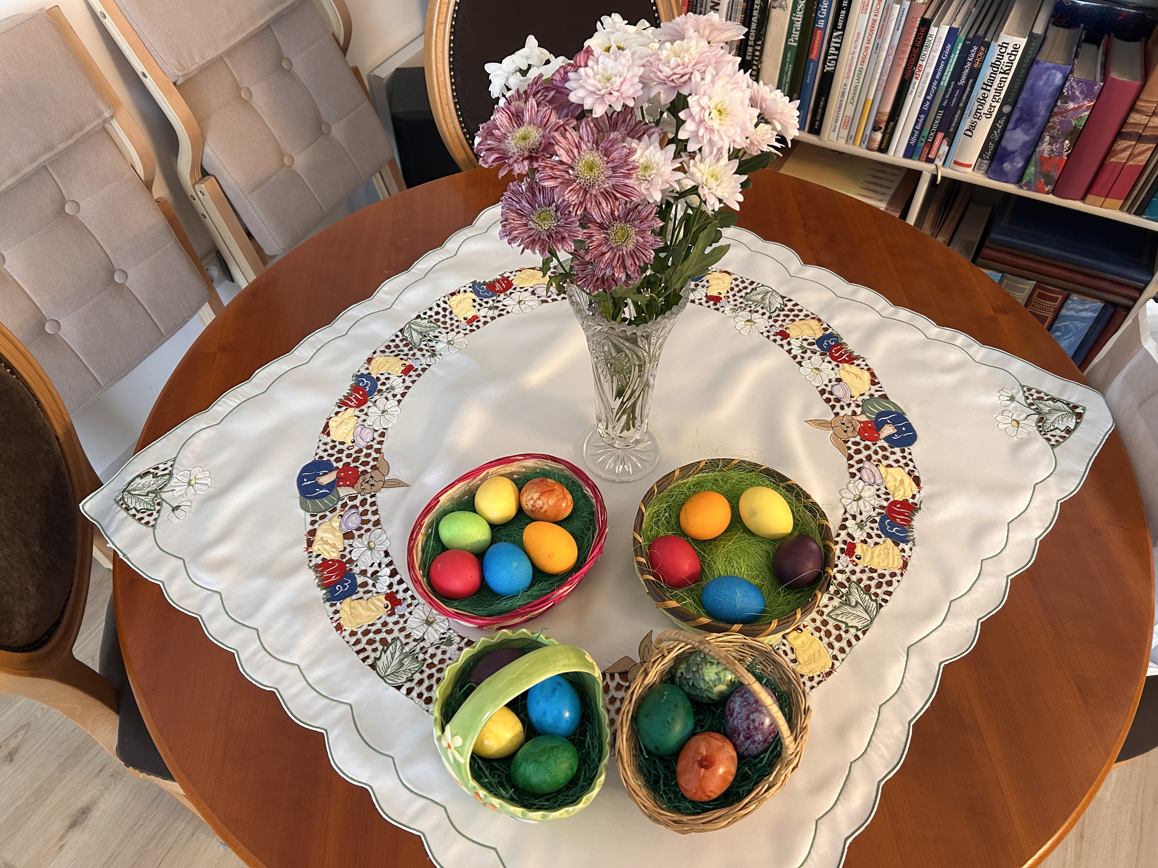Heute, da die Kinder erwachsen sind und ihren eigenen Haushalt leben, ist noch das traditionelle Eierfärben geblieben. Die bunten Eier symbolisieren die Rückkehr der Farben in die Welt und das Ei das Leben, auch wenn es nach dem Kochen erlischt und das Ei am Ende durch Verzehr in den Lebenskreislauf zurückgegeben wird.